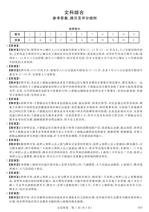 河南省八市重点高中2024届高三4月第一次模拟文科综合答案