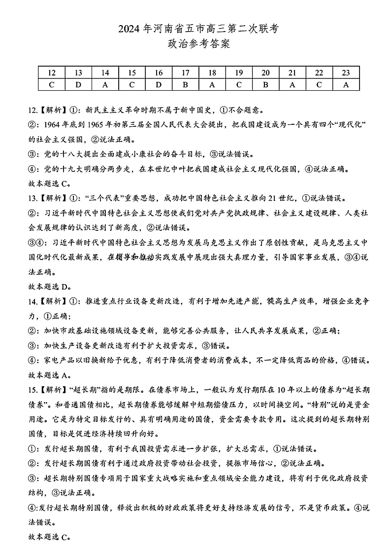 河南省五市2024届高三第二次联考政治答案