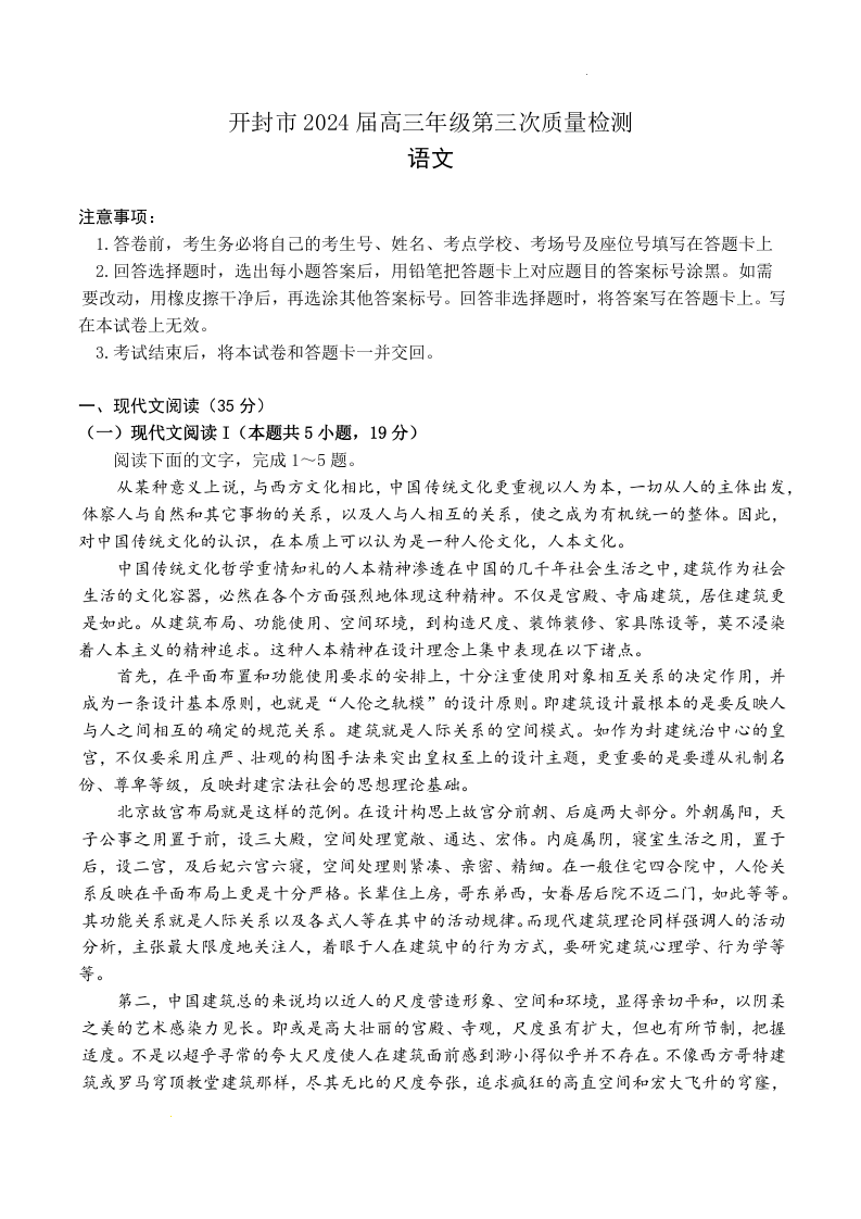 河南省开封市2024届高三年级第三次质量检测(三模)语文