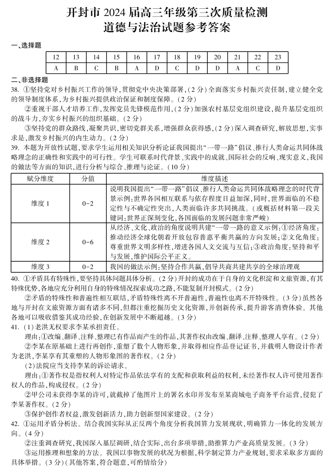 河南省开封市2024届高三年级第三次质量检测(三模)政治答案