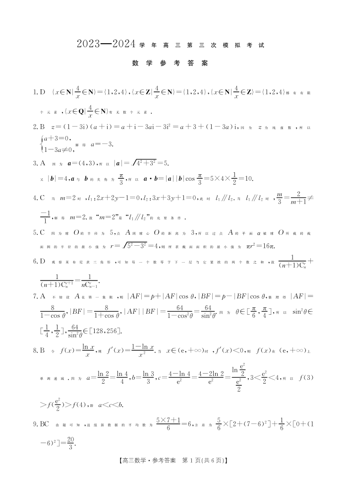 河南省新乡市2024届高三下学期三模考试(三模)数学答案