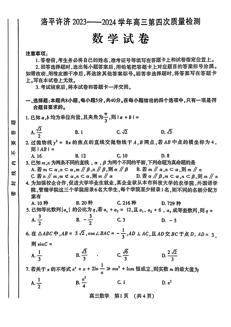 河南省平许济洛四市2024届高三下学期第四次质量检测数学