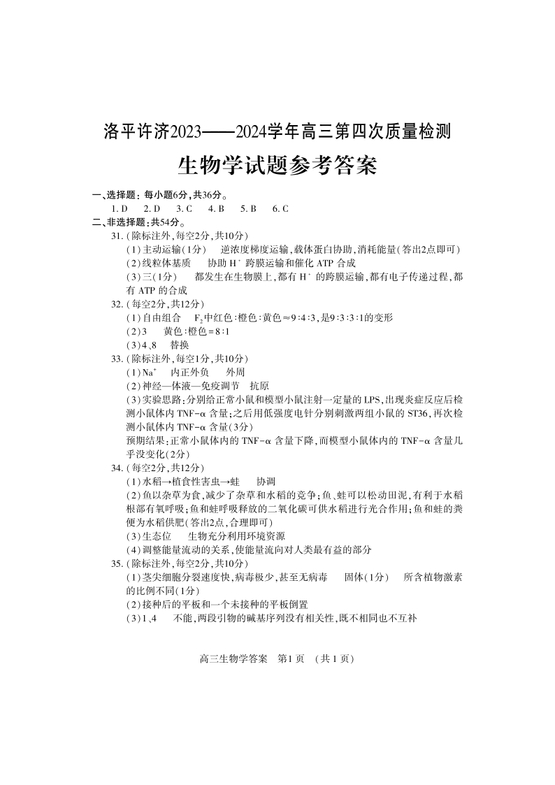 河南省平许济洛四市2024届高三下学期第四次质量检测理科综合答案