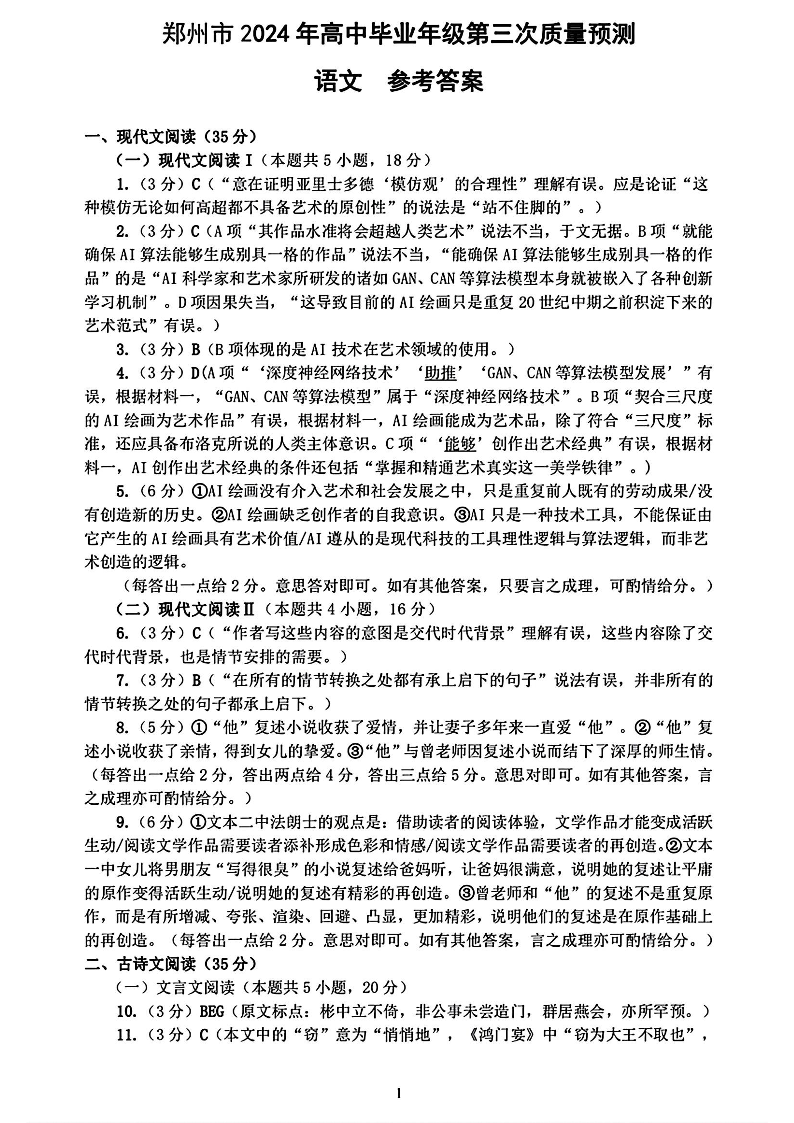 河南省郑州市2024届高三下学期第三次质量预测语文答案