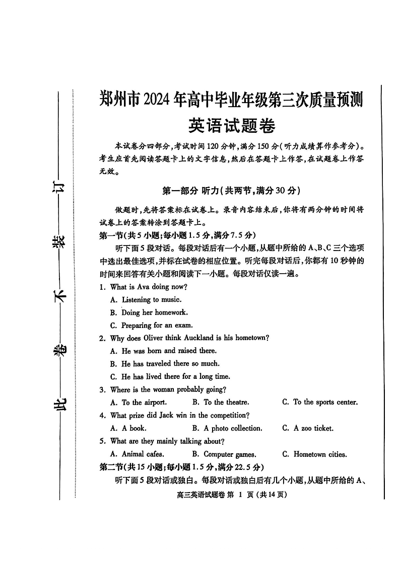 河南省郑州市2024届高三下学期第三次质量预测英语