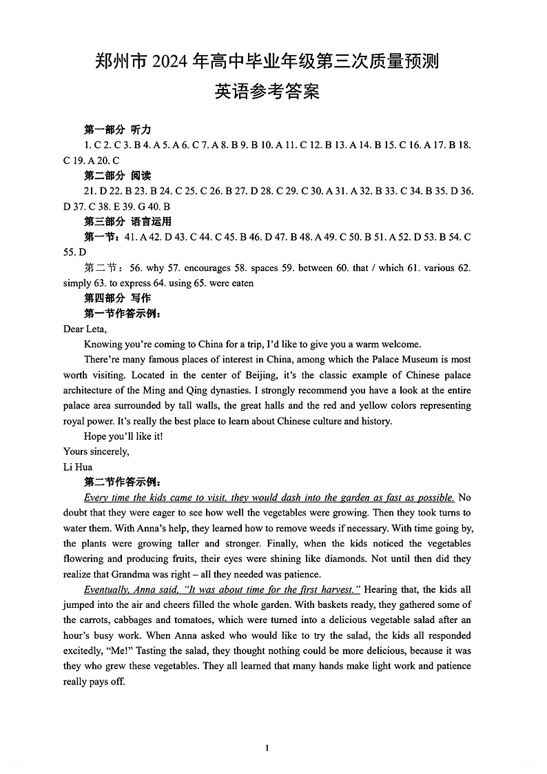 河南省郑州市2024届高三下学期第三次质量预测英语答案