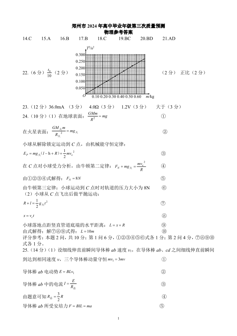 河南省郑州市2024届高三下学期第三次质量预测物理答案