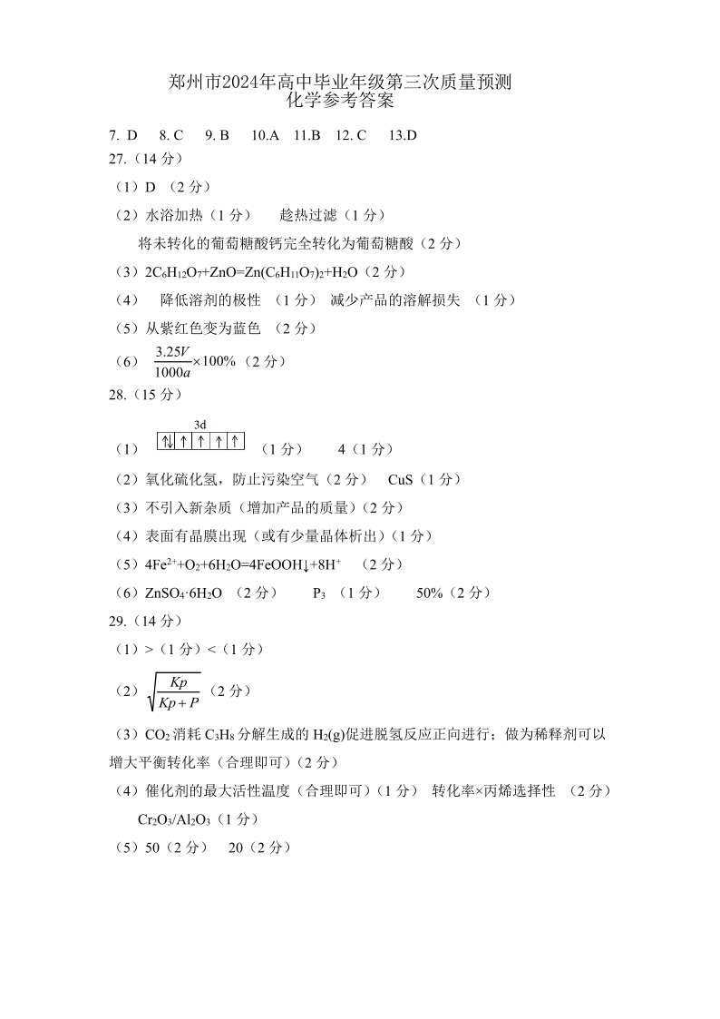 河南省郑州市2024届高三下学期第三次质量预测化学答案
