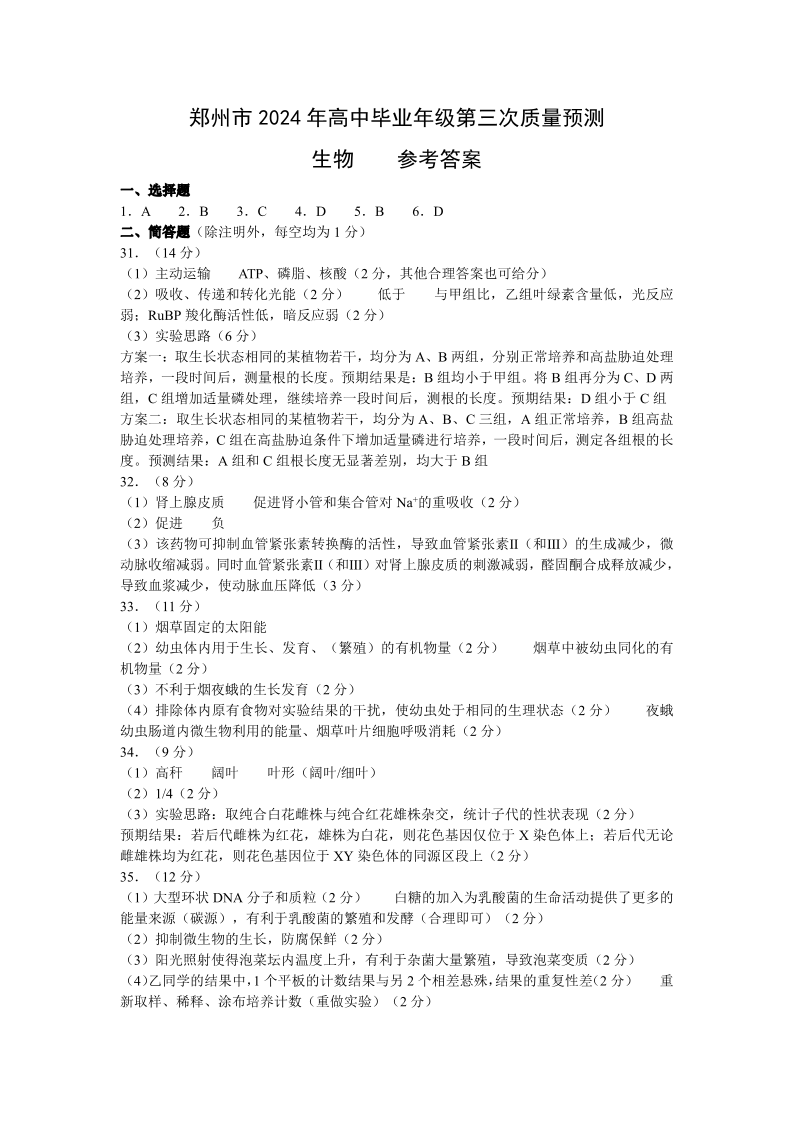河南省郑州市2024届高三下学期第三次质量预测生物答案
