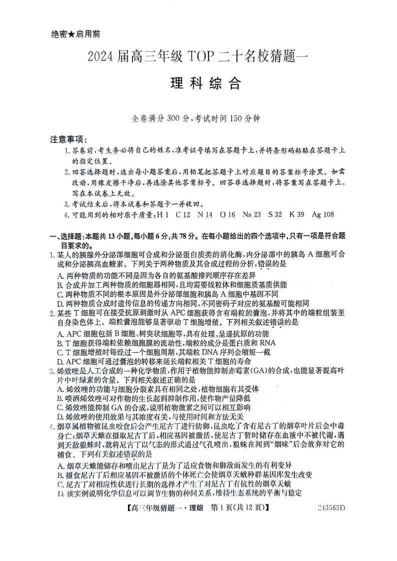 河南省TOP二十名校2024届高三年级5月联考猜题(一)理科综合