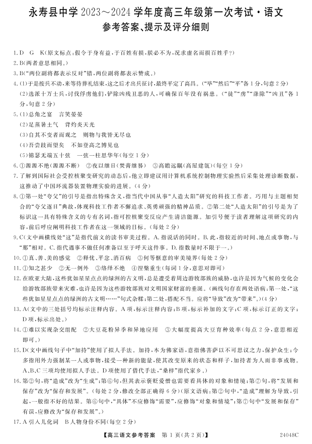 陕西省咸阳市永寿县中学2023-2024学年度高三第一次考试语文答案