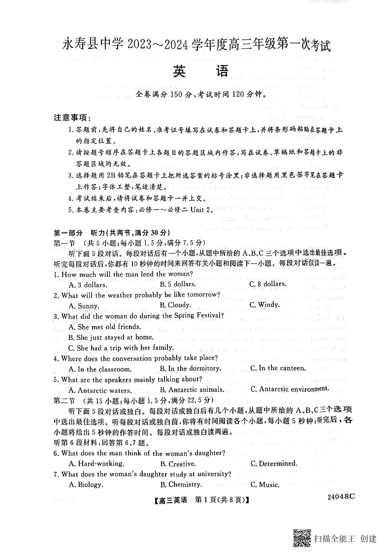 陕西省咸阳市永寿县中学2023-2024学年度高三第一次考试英语