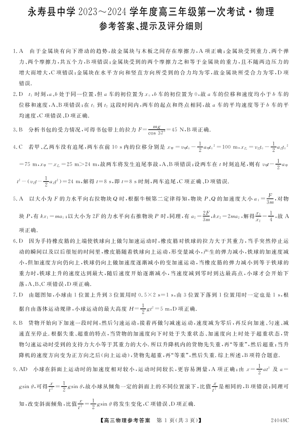 陕西省咸阳市永寿县中学2023-2024学年度高三第一次考试物理答案