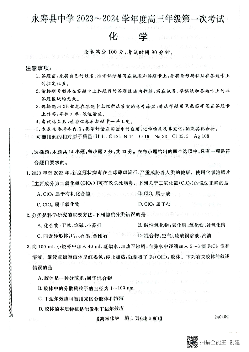 陕西省咸阳市永寿县中学2023-2024学年度高三第一次考试 化学