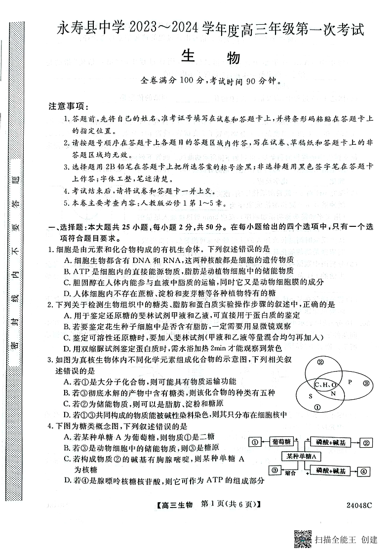 陕西省咸阳市永寿县中学2023-2024学年度高三第一次考试生物