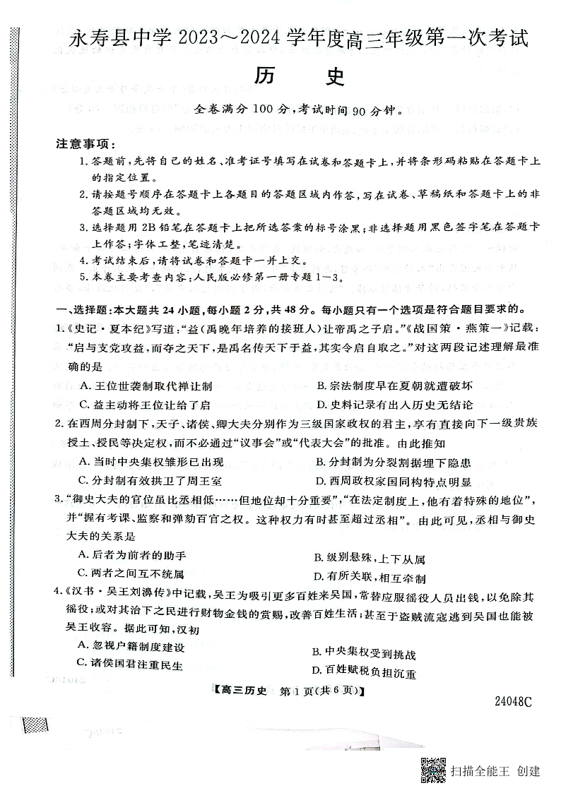 陕西省咸阳市永寿县中学2023-2024学年度高三第一次考试历史