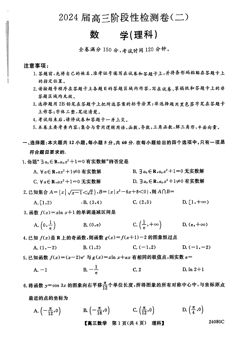 陕西省宝鸡教育联盟2024届高三上学期阶段性检测(二)理数