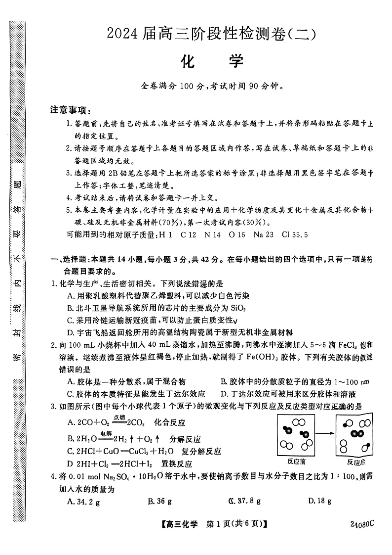 陕西省宝鸡教育联盟2024届高三上学期阶段性检测(二)化学