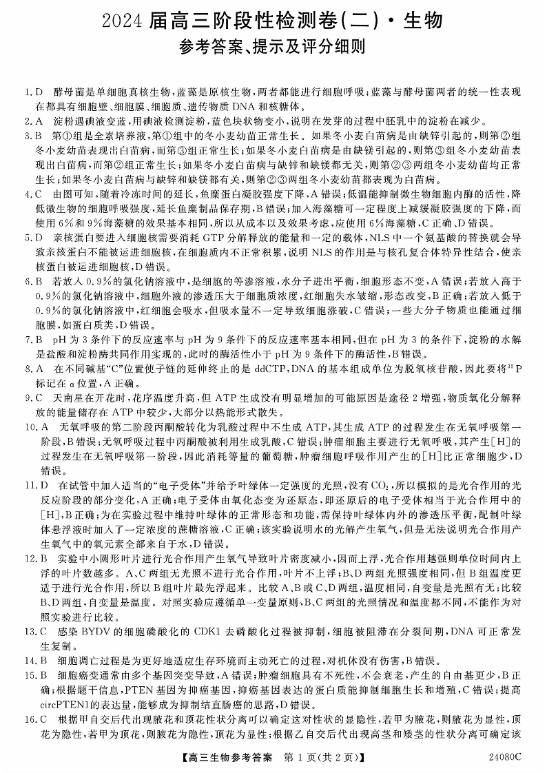 陕西省宝鸡教育联盟2024届高三上学期阶段性检测(二)生物答案