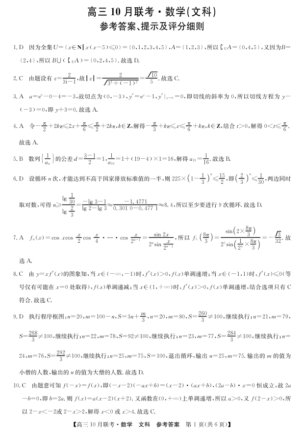 陕西省安康市重点名校2024届高三上学期10月联考数学(文科)答案