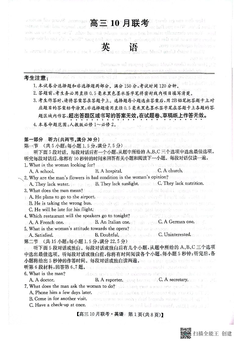 陕西省安康市重点名校2024届高三上学期10月联考英语