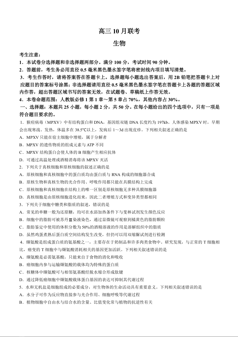 陕西省安康市重点名校2024届高三上学期10月联考生物含答案