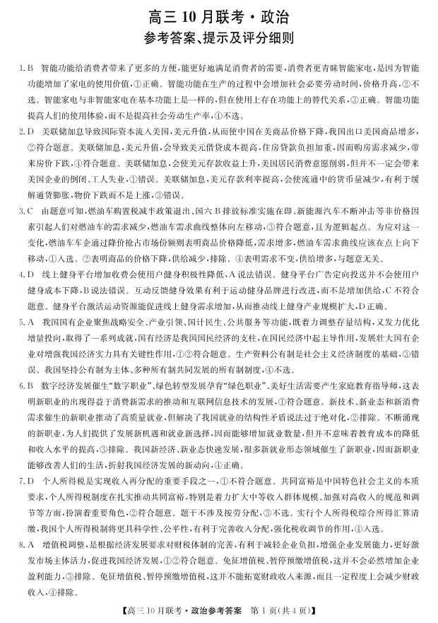陕西省安康市重点名校2024届高三上学期10月联考政治答案