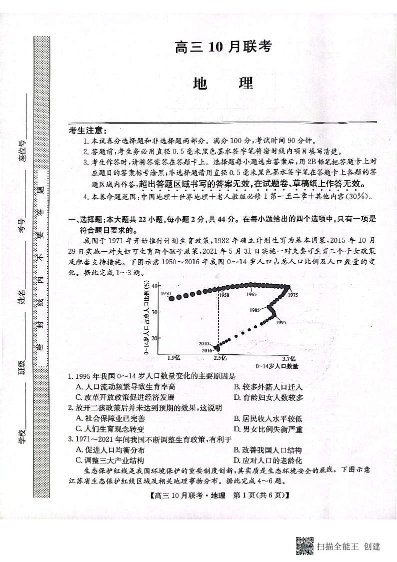 陕西省安康市重点名校2024届高三上学期10月联考地理