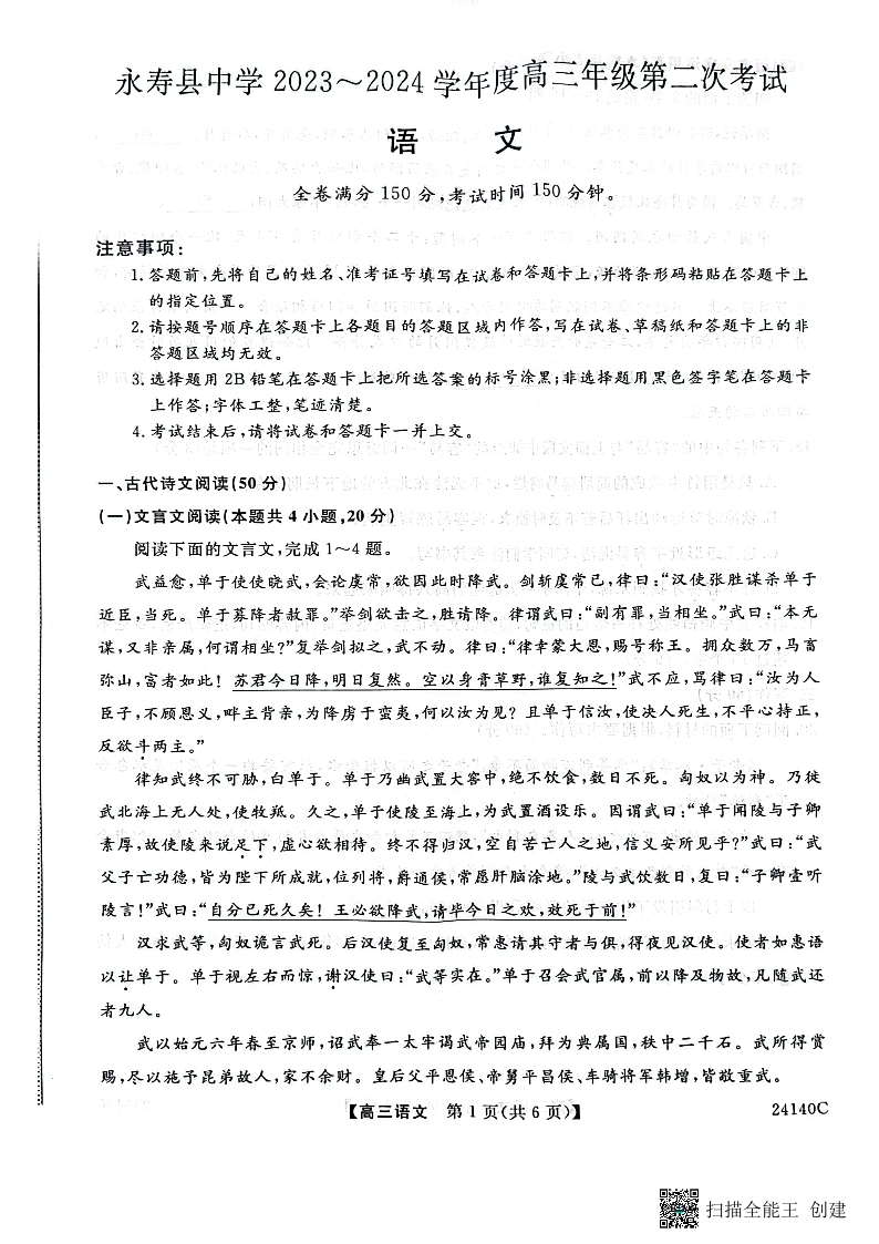 陕西省咸阳市永寿县中学2023-2024学年高三上学期第二次月考 语文