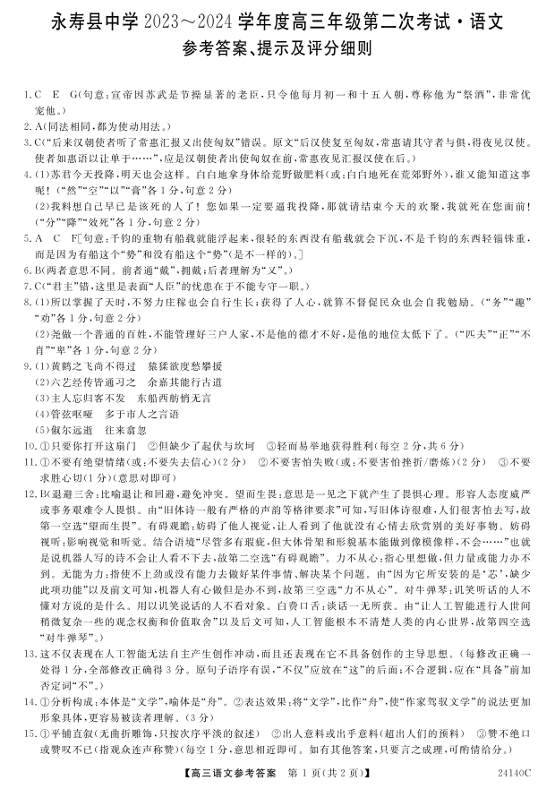 陕西省咸阳市永寿县中学2023-2024学年高三上学期第二次月考 语文答案