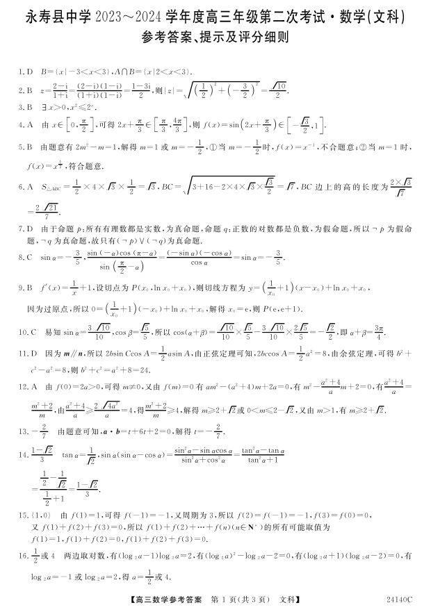 陕西省咸阳市永寿县中学2023-2024学年高三上学期第二次月考 文数答案