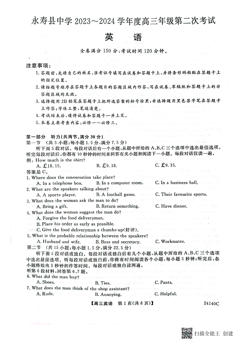 陕西省咸阳市永寿县中学2023-2024学年高三上学期第二次月考 英语