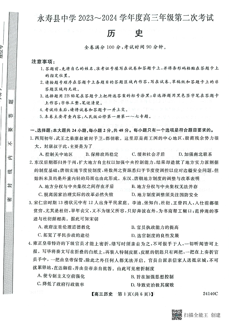 陕西省咸阳市永寿县中学2023-2024学年高三上学期第二次月考 历史