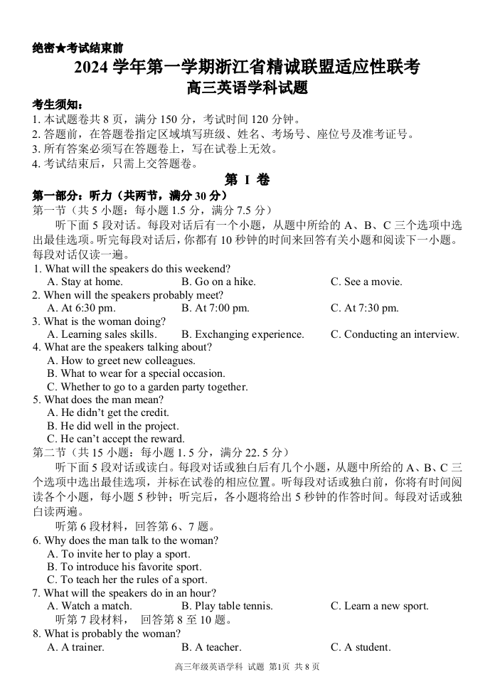 浙江省精诚联盟2025届高三上学期12月适应性联考英语