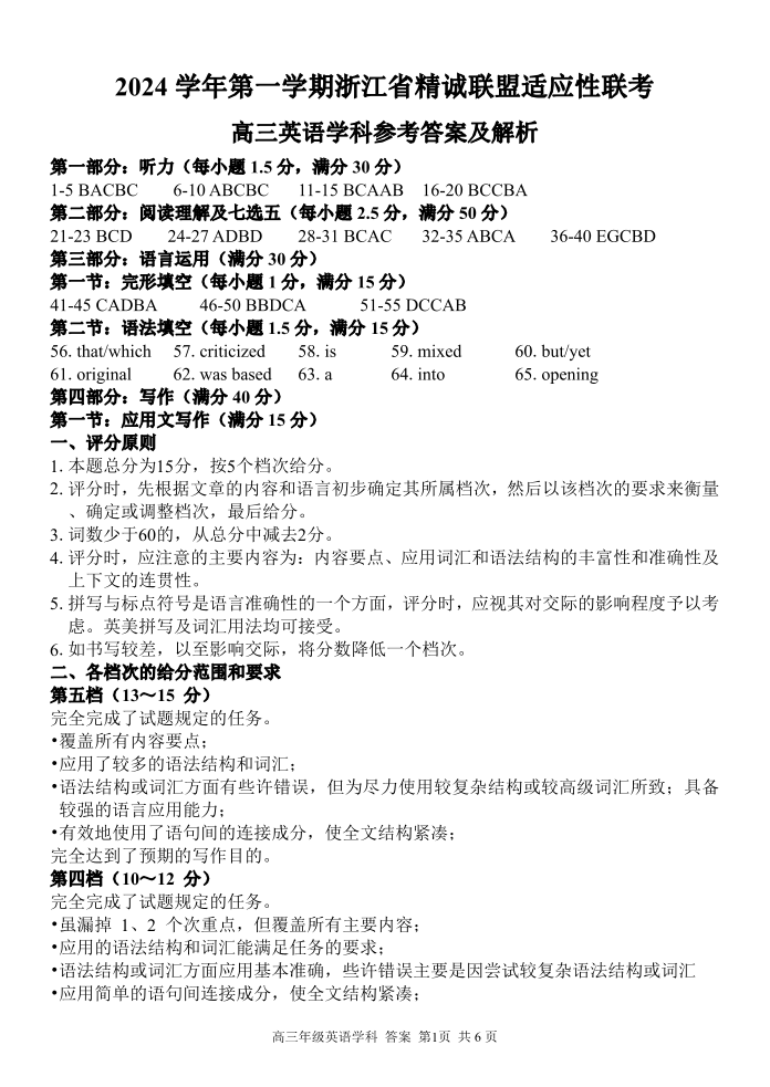 浙江省精诚联盟2025届高三上学期12月适应性联考英语答案