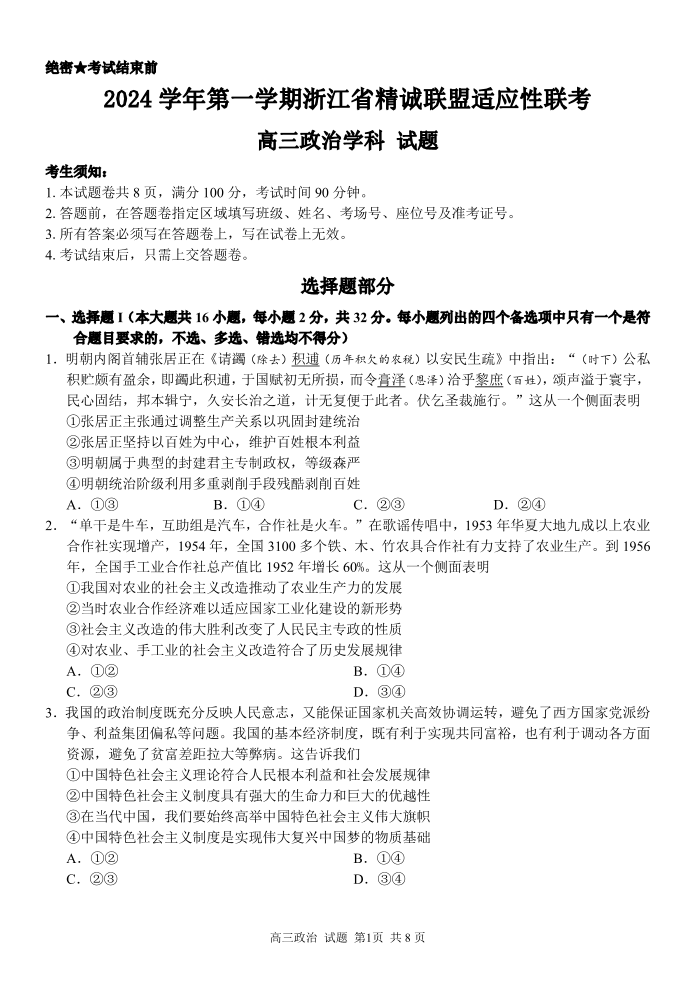 浙江省精诚联盟2025届高三上学期12月适应性联考政治