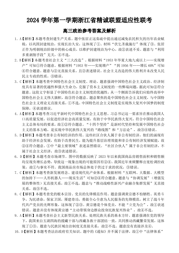 浙江省精诚联盟2025届高三上学期12月适应性联考政治答案