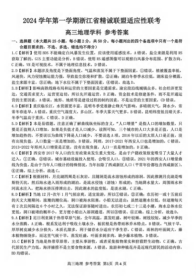 浙江省精诚联盟2025届高三上学期12月适应性联考地理答案