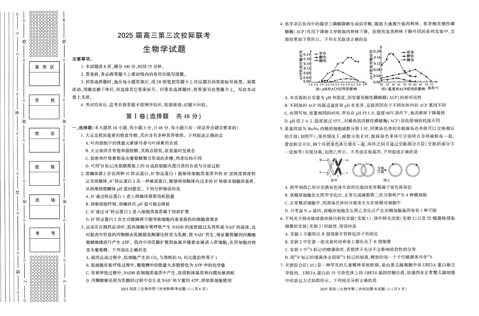 陕西省汉中市2025届高三上学期12月第三次校际联考生物+答案