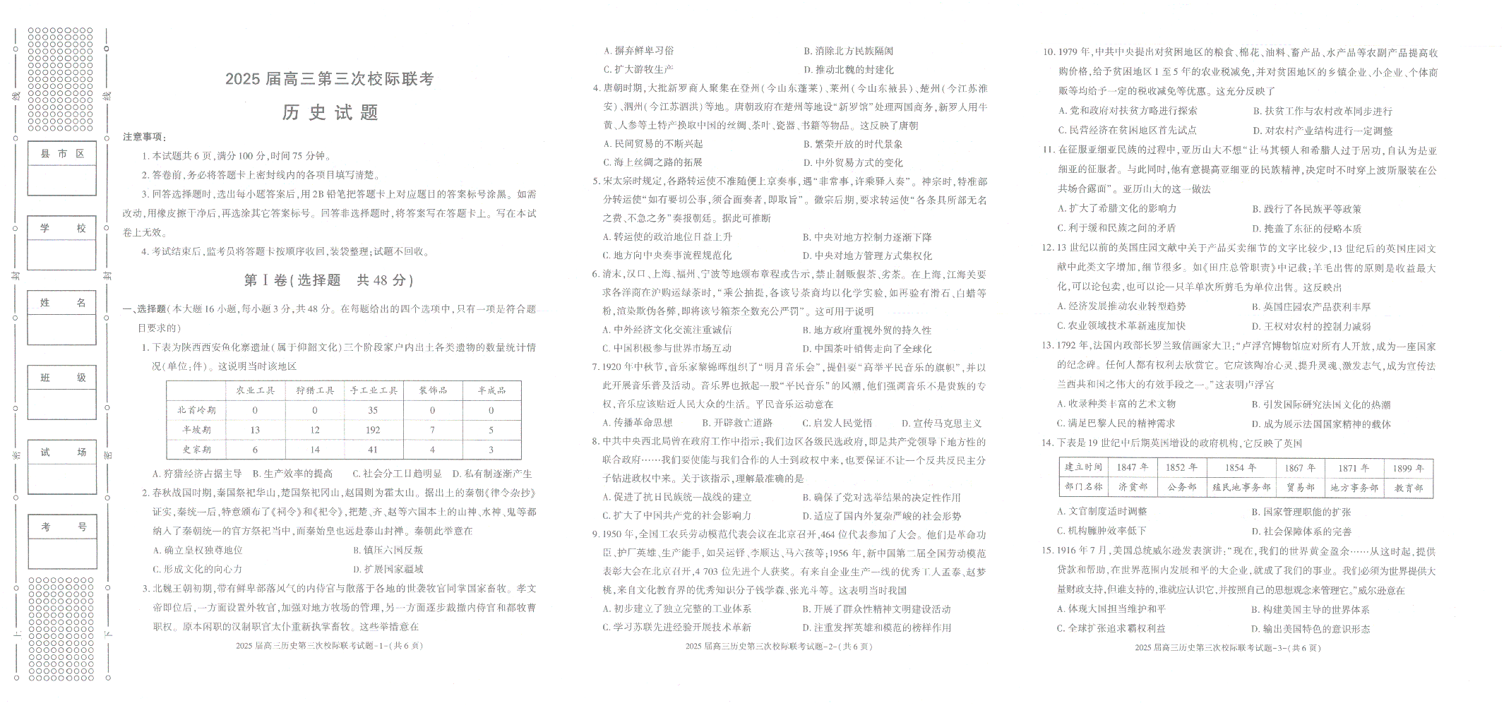 陕西省汉中市2025届高三上学期12月第三次校际联考历史+答案