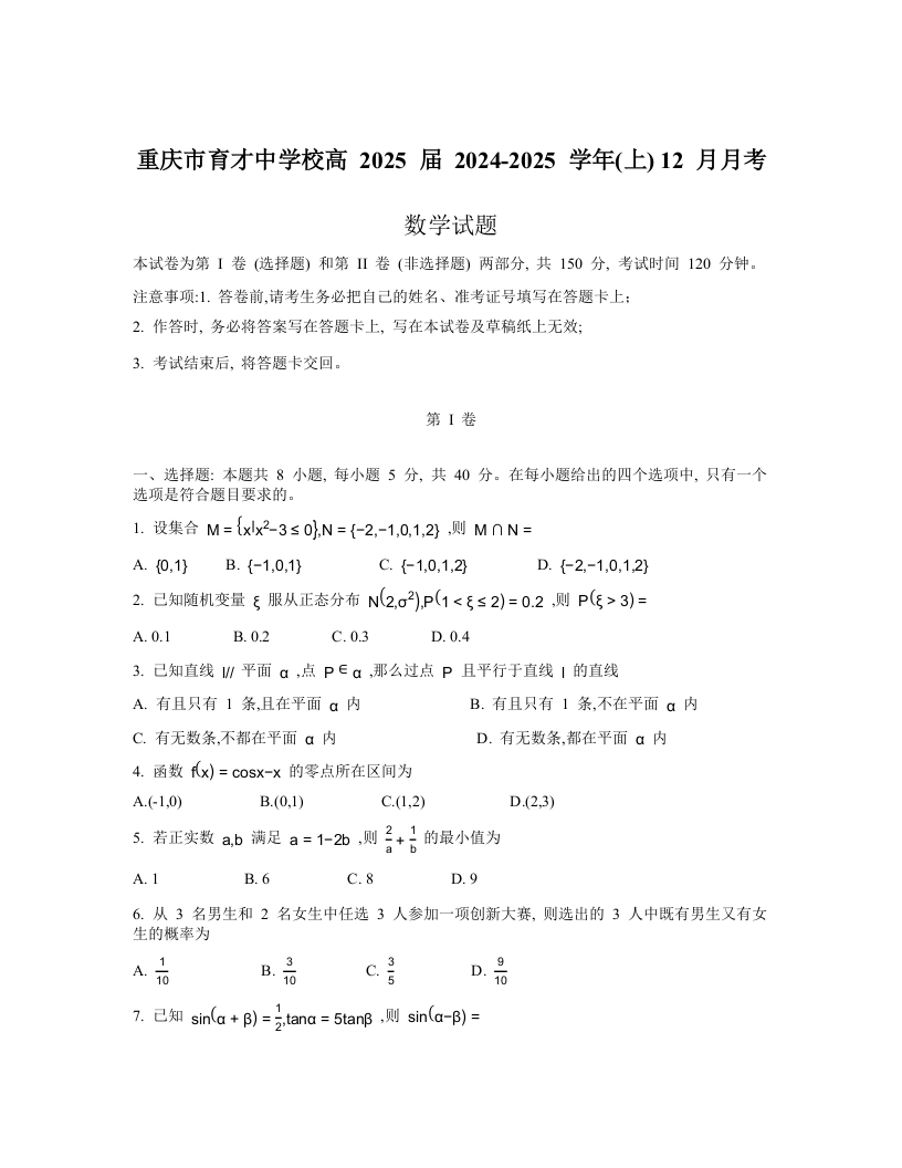 重庆市育才中学2025届高三上学期12月月考数学+答案