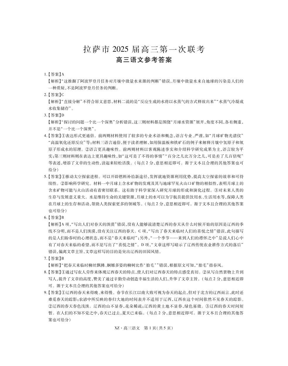 西藏自治区拉萨市2025届高三年级第一次联考语文答案