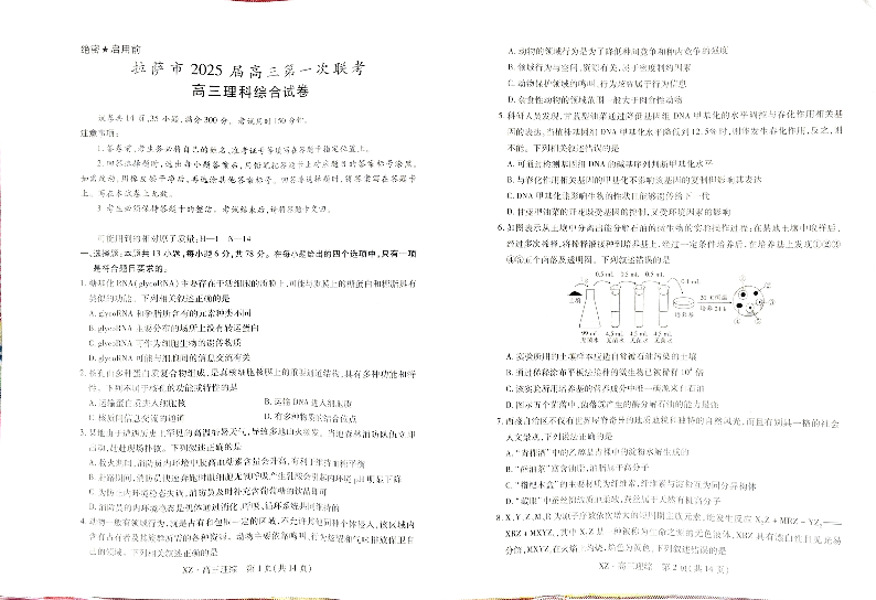 西藏自治区拉萨市2025届高三年级第一次联考理科综合