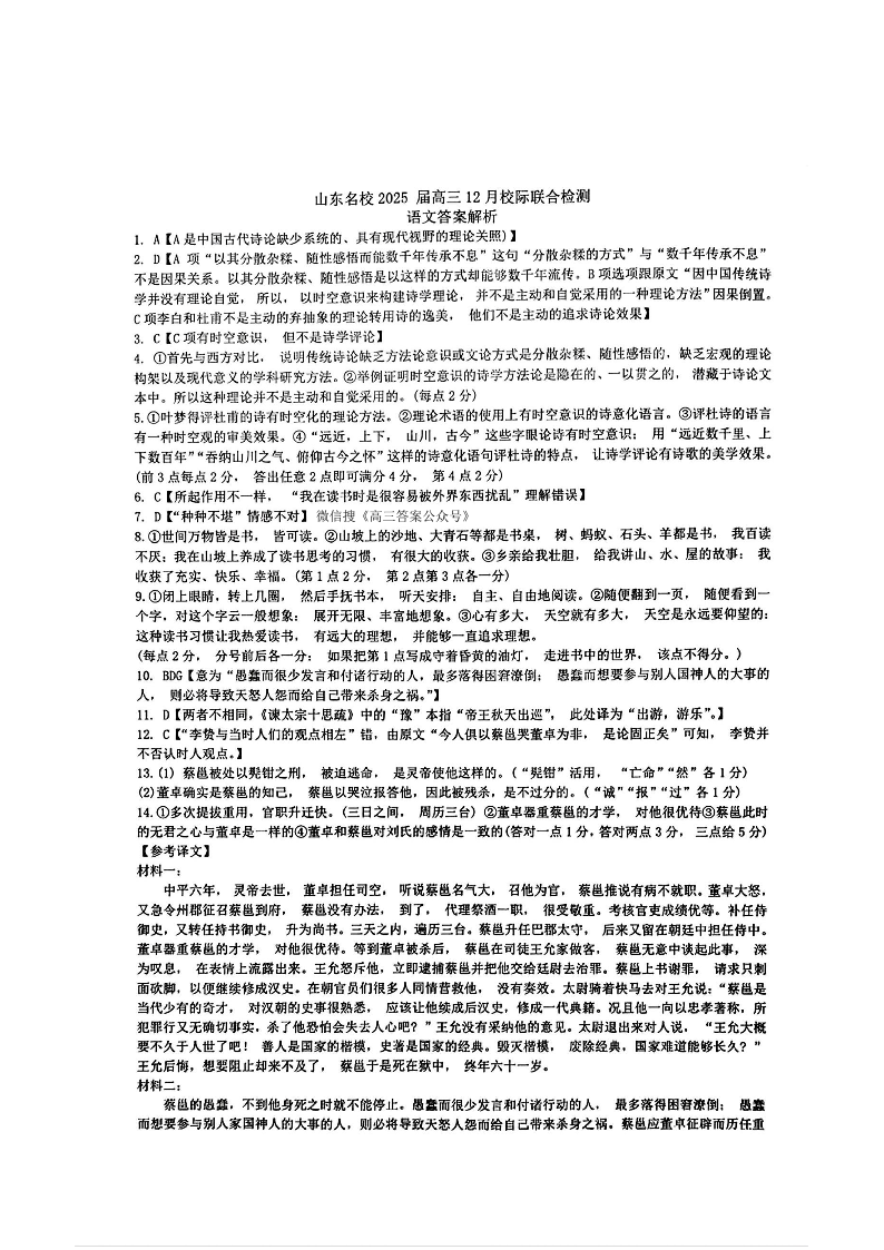 山东省区域名校2025届高三上学期12月校际联合检测语文答案