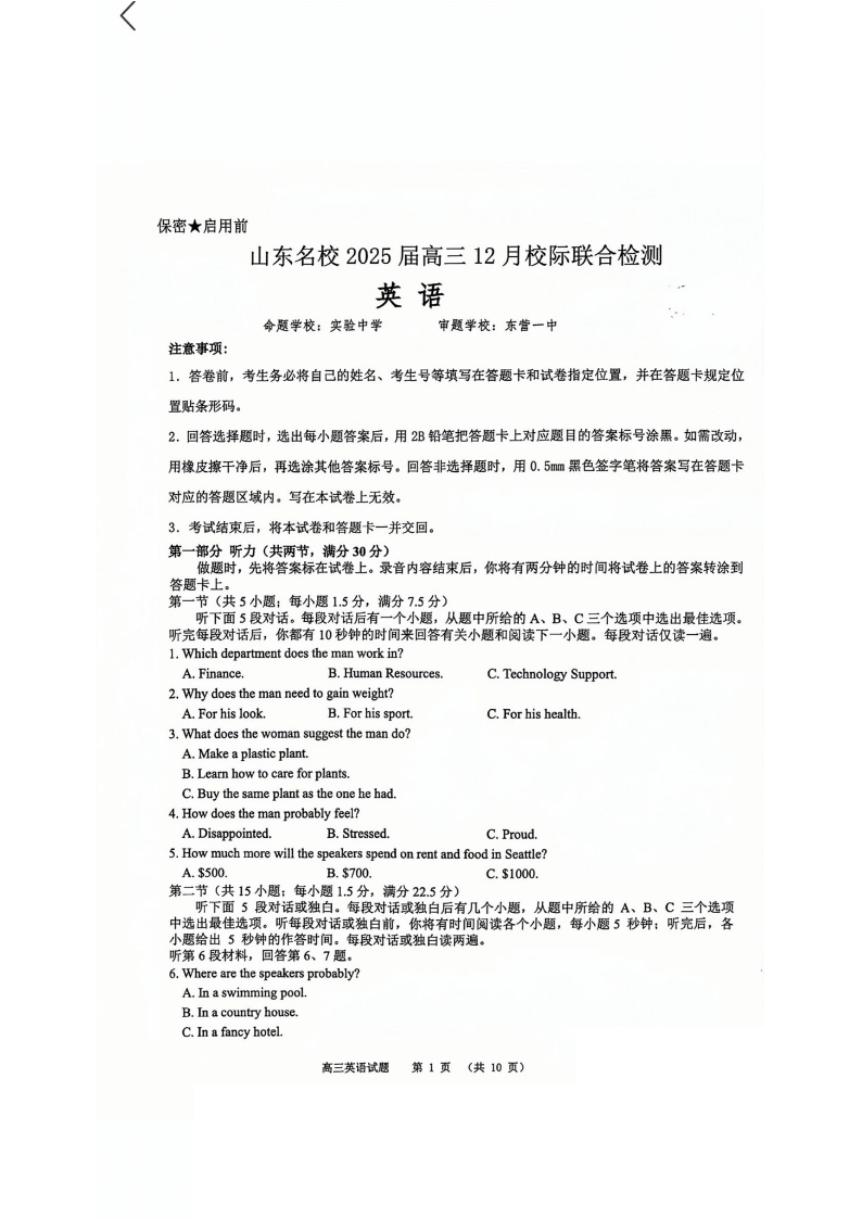 山东省区域名校2025届高三上学期12月校际联合检测英语+答案