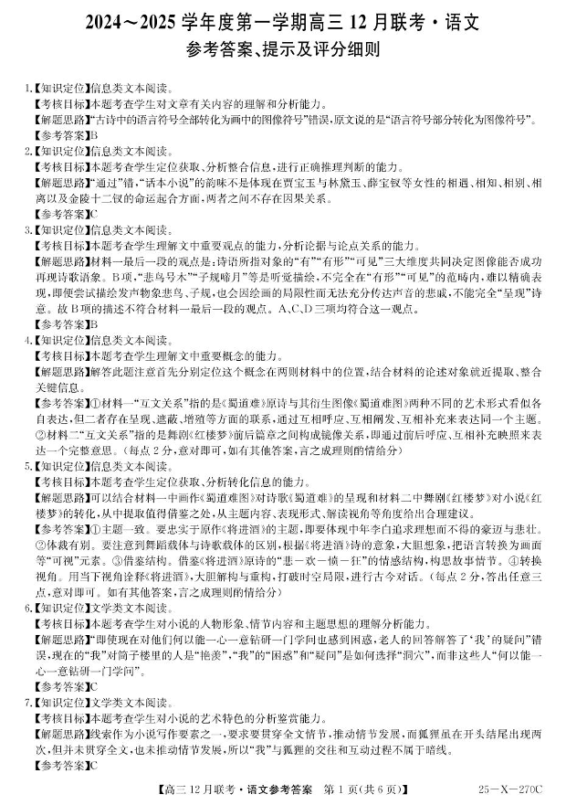 安徽省县中联盟2025届高三上学期12月联考语文答案
