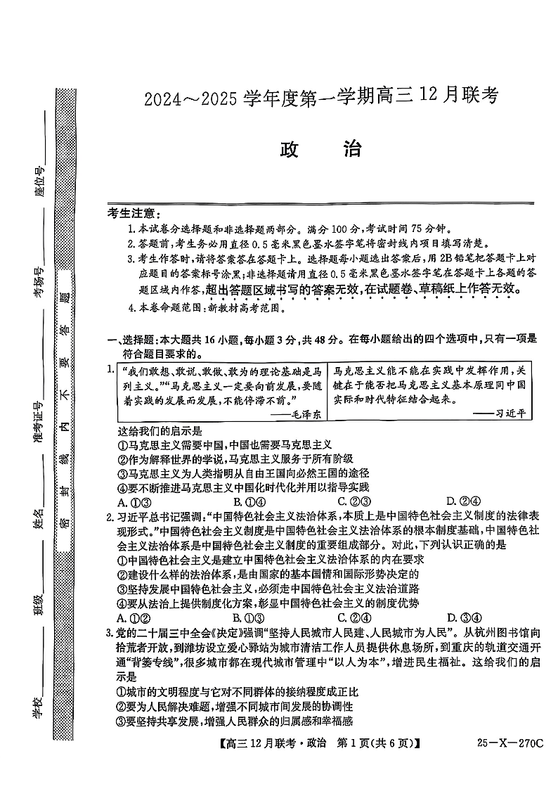 安徽省县中联盟2025届高三上学期12月联考政治+答案