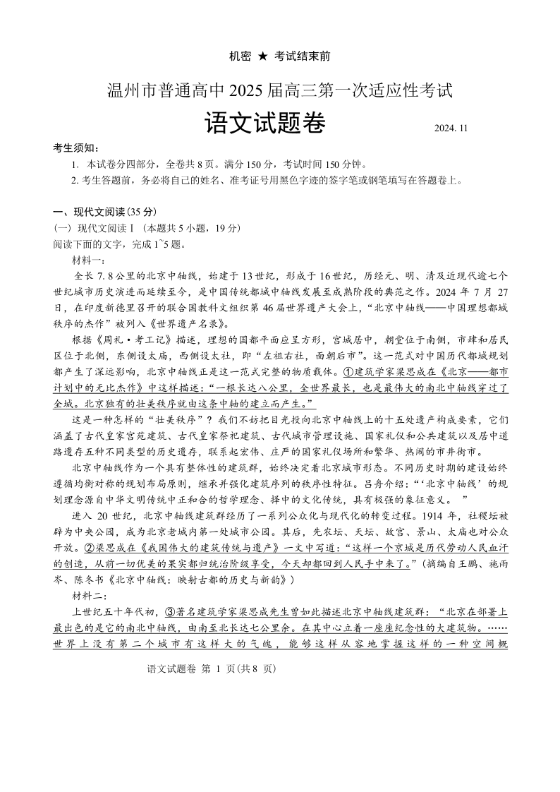 浙江省温州市高中2025届高三上学期第一次模拟考试语文+答案