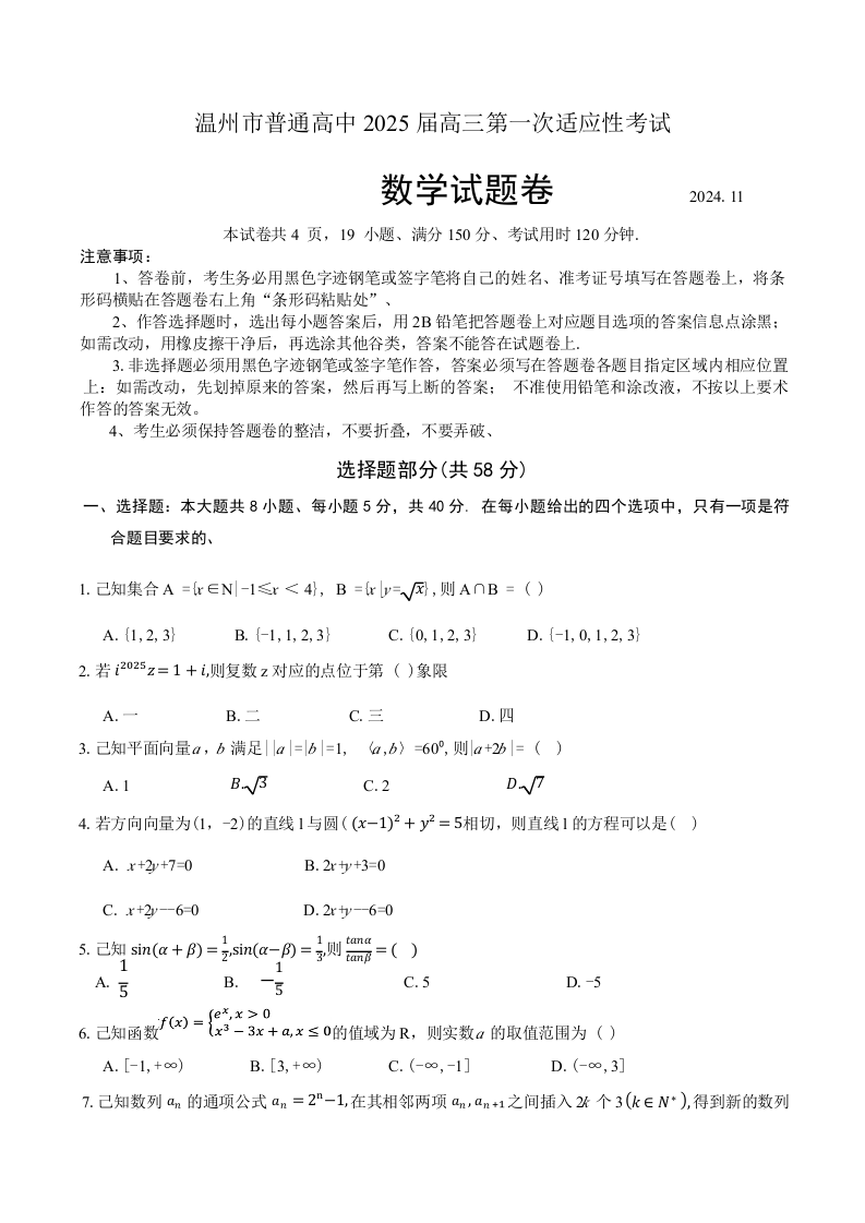 浙江省温州市高中2025届高三上学期第一次模拟考试数学+答案