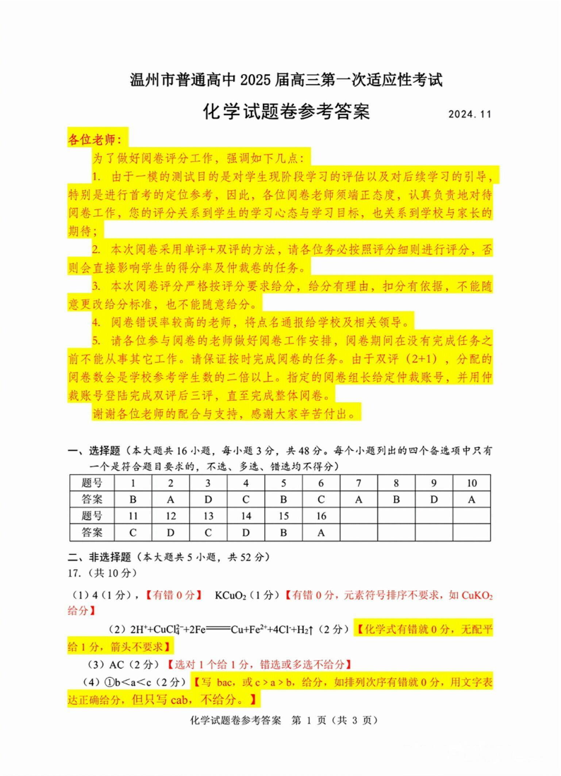 浙江省温州市高中2025届高三上学期第一次模拟考试化学答案